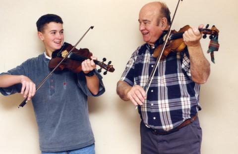 Pete Doiron's father Adolphe Doiron was the local blacksmith and the premier fiddler in the Rustico region. As a youngster Pete often heard fiddling at house parties, tea parties, parish picnics, school picnics, and weddings. He fondly recalls that at his family's own house parties, sometimes several step-dancers would get up to dance at once.
