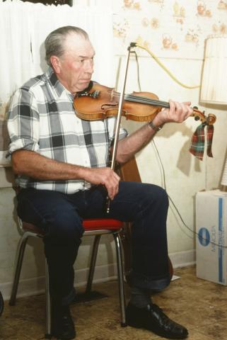 Hughie McPhee's family has occupied the same property on the north shore of Northeast Kings County since the late 18th century. His father John J. McPhee was a noted local fiddler. Hughie learned a few tunes on fiddle as a young​ster, but he played mostly guitar until his mid-20s. His parish was hoping to raise money for a new church with a series of benefit dances, but no one in the area was available to play fiddle for them. They asked him to see if he could fill the role. He picked up the instrument again, and found that all the tunes he had heard around the house as a child were instantly available to him. In the late 1970s, both he and his brother Dan were founding members of the Eastern Kings Fiddlers. Since then, most of the new tunes he has learned have emanated from Cape Breton. He had not been playing regularly in the few years prior to the 2006 interview.