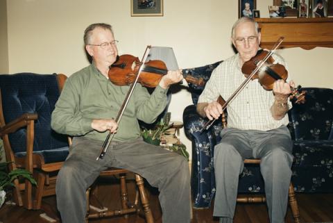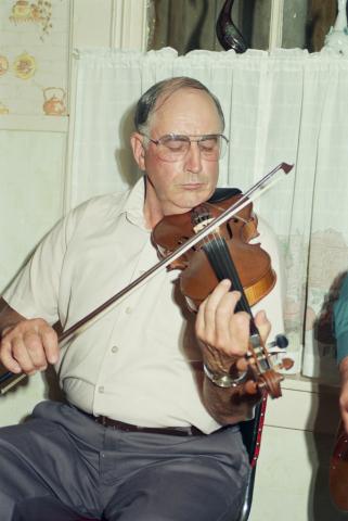 During the 1950s, Jackie played frequently at local house parties and sometimes filled in for his father at dances when the latter took sick. When he got a permanent job on the Bordon-Cape Tormentine ferry, however, his hectic schedule left him little time or inclination to play. As he approached retirement in the late 1980s, however, he began playing much more regularly. Soon Carl and Jackie (who live directly across the road from each other) started meeting regularly to play, both for their own enjoyment and in performance at benefit concerts and music parties. Their duets are of particular interest because they play in nearly perfect unison: a phenomenon that is quite rare among ear players on PEI.