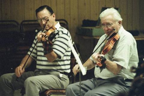 Ed started playing at about age 18, when he picked up an old two dollar fiddle. He said, "I'd just take it into the barn and hang it up on a nail [when I was done]. I just gradually learned, and [now] I have it half right and half wrong. That's that's why I can't read music. I never learned it; I was too stubborn to try and I didn't end up too good really. I'm fightin 'er out now!"