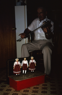 Abstract: Abstract:Joseph Doucette shows off his handiwork: homemade "Dancing Dolls": July, 1992