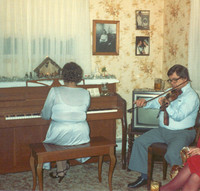 Abstract: Abstract:Toussaint Arsenault on the fiddle and his wife Anne Marie at the piano. Summerside, circa 1980. - Emily Blacquiere Collection.